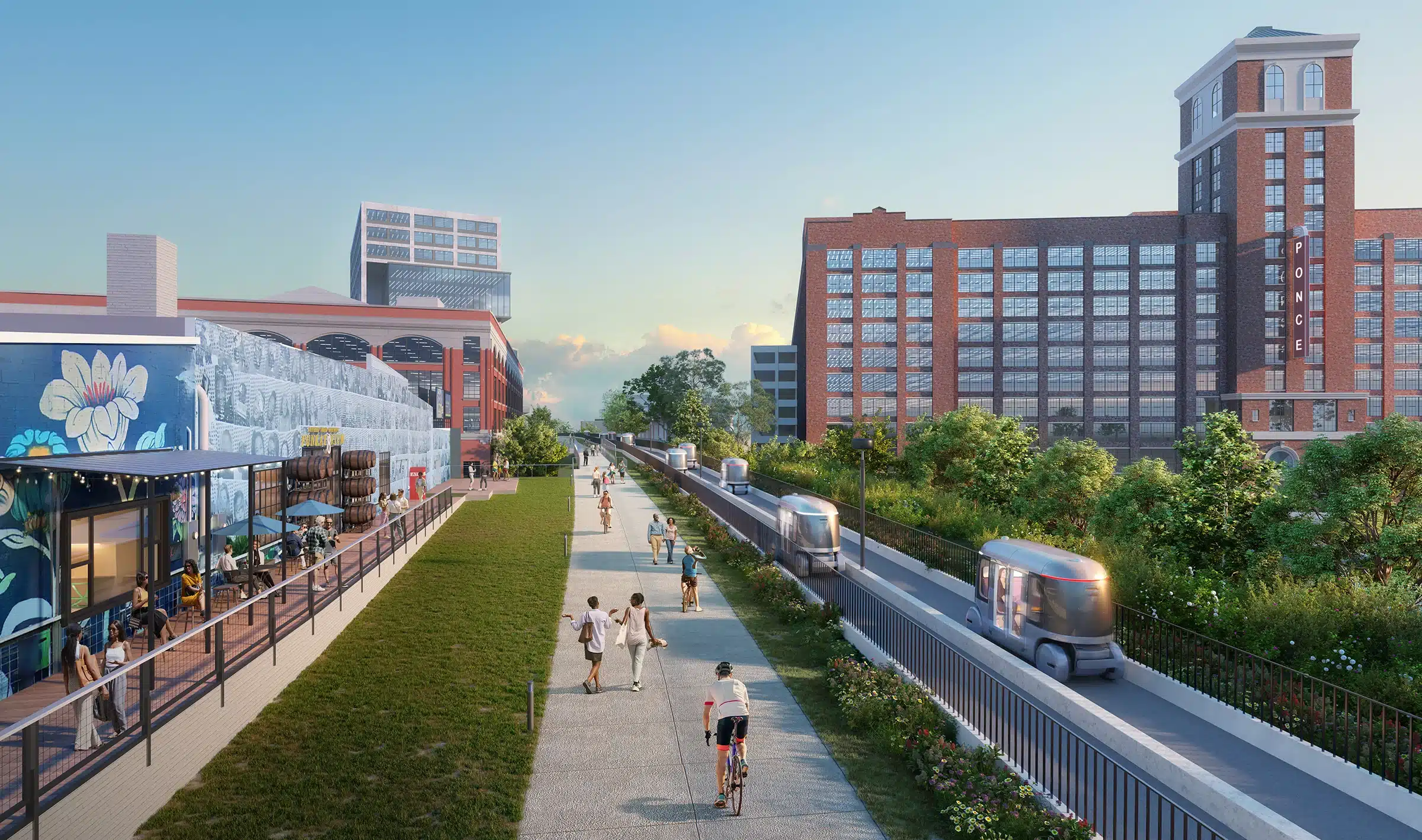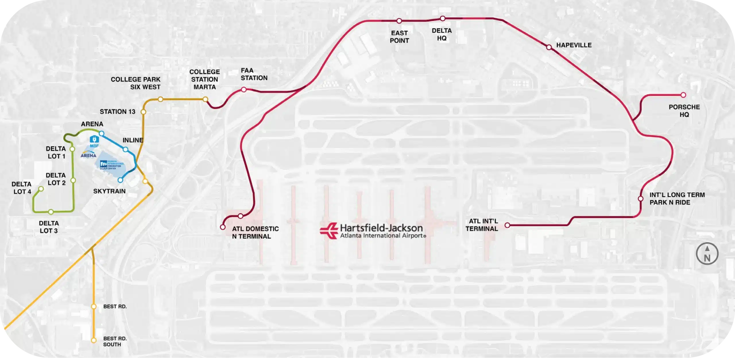 Atlanta Personal Rapid Transit Solutions (APRTS) will deliver an on-demand Automated Transit Network Pilot along a 0.5-mile exclusive guideway, providing direct, autonomous service between the SkyTrain and the Georgia International Convention Center/Gateway Arena.